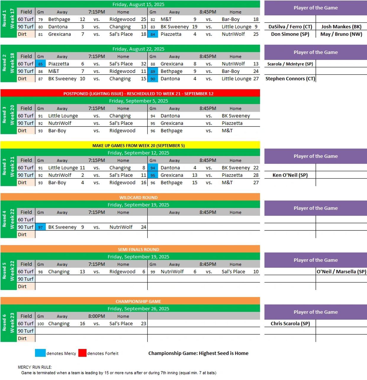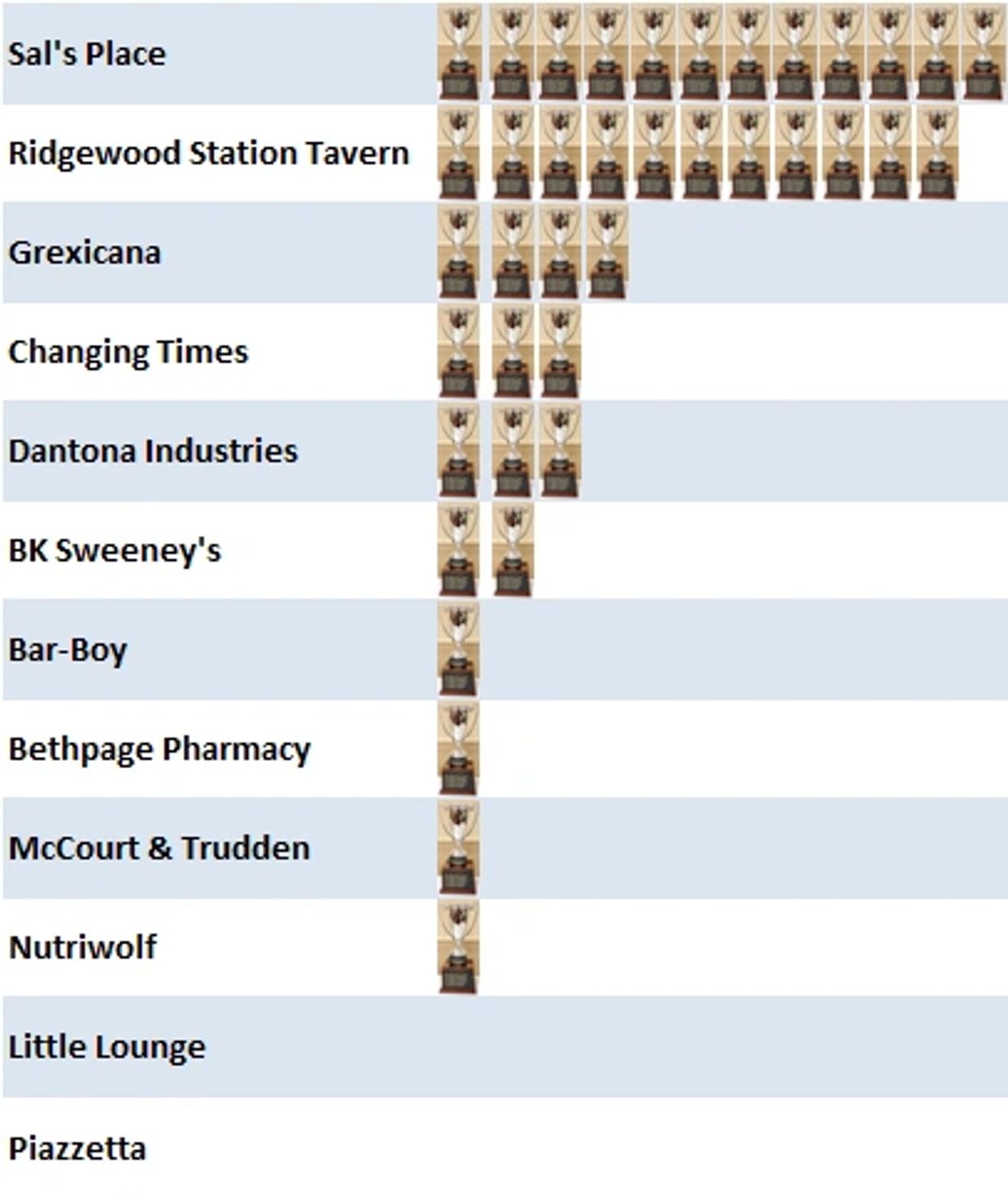 The inaugural "Reilly Cup" was presented to Granny O'Shea's (currently Grexicana) as the 2007 Tournament Champions. Past champions are inscribed on the trophy and each year the "Cup" will pass to the league's newest champion.